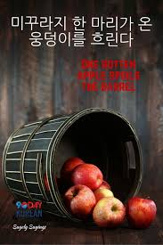 Words nearby one rotten or bad apple spoils the barrel. Congress is corrupted like a barrel of fruit by the presence of one bad guy or one bad apple there are a lot of other groups to which this dictum has been employed. The saying in thai we say ปลาเน าต วเด ยวเหม นท งข อง means one rotten fish spoil the whole creel or literally means one rotten fish make the whole creel smelly. The saying in english is one bad apple spoil the whole barrel or one rotten apple spoil the whole barrel.