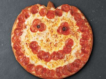 The chain s classic jack o lantern pizza is a large thin crust pepperoni pizza decorated with a pepperoni border smile and triangle shaped eye sockets set off with black olives.
